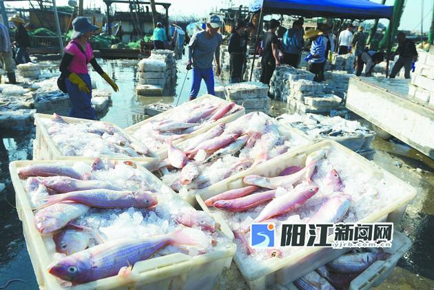 当日下午,记者在闸坡渔港水产品交易市场发现,码头旁停靠着大批回港的渔船,远远望去密密麻麻一片。码头上人头攒动,渔民们正在紧张地忙碌着。他们把船舱里的渔获搬上码头,与顾客交易,将渔获分类过秤,一时间吆喝声、讨价还价声此起彼伏。手推车、三轮车、货车川流不息,一箱箱渔获被搬上货车,再运送到各地市场,到处是一片热火朝天的场景。