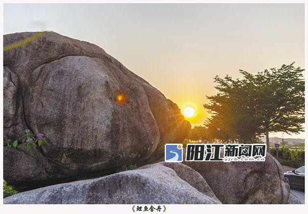 端详鲤鱼石,你会看到,它张开圆圆的嘴,斜刺里冲向海仔湖,仿佛在拼命呼吸空气,给人一种威严与神秘的感觉;那大大鼓起的鳃盖,正配合着吸吐纳气。肥大的腹部高高凸起,鼓鼓囊囊,像是装满了无数的鱼卵;高高翘起的尾鳍苍劲有力,直指南海月亮湾的海空,仿佛还携带着刚从水中跃出未散的仙气。鲤鱼石挺着硕大的身躯,凝固的姿态呈现出一道优美弧线,展现出一种既灵动又艰辛的美。石身上淡红色的鳞片布满了岁月的沧桑斑点,在阳光下熠熠生辉,散发着迷人的光彩。
