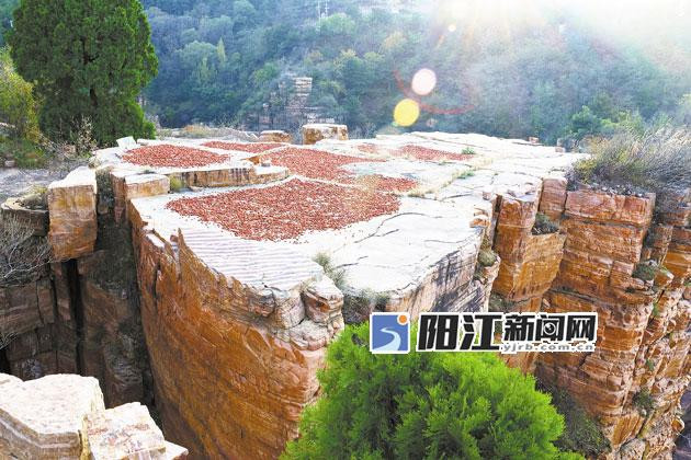 十月的太行山秋色绚丽壮美。凤凰山人把晒盘搬到悬崖边,让红山楂与黄玉米在深渊上空晾晒,形成一道独特的丰收图景。