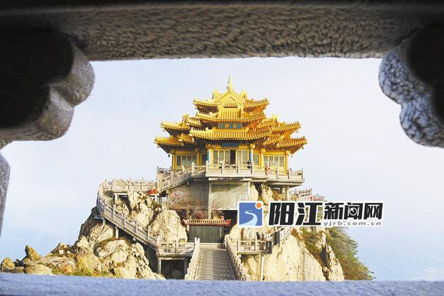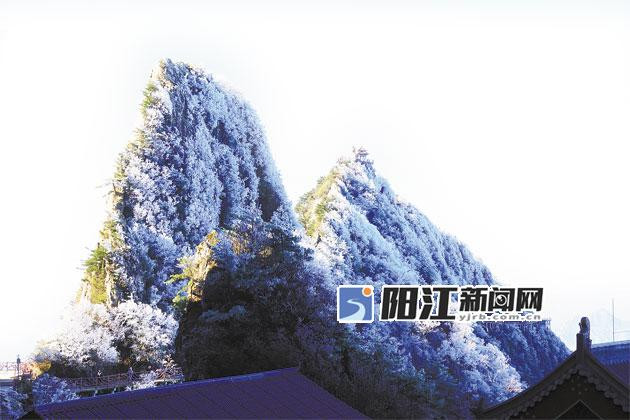 山顶,道德府巍峨居中,五母金殿、亮宝台、玉皇顶呈“品”字铺开,熠熠生辉,而托举道观的山体轮廓如鸾鸟展翅,微昂着头,披着银白的羽毛,款款而来,殿顶在素白世界里,静静悬浮。