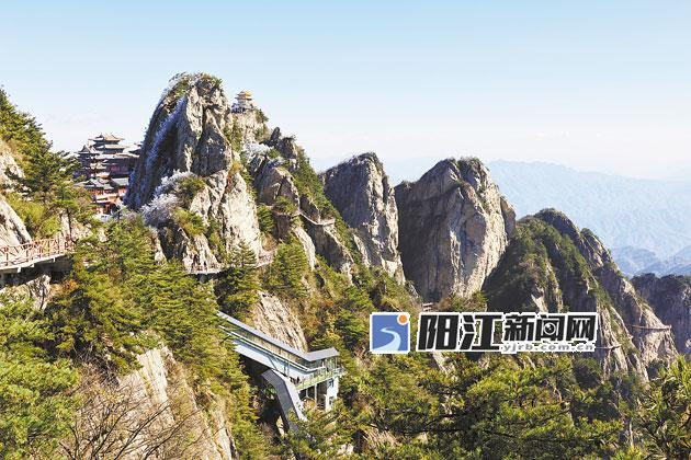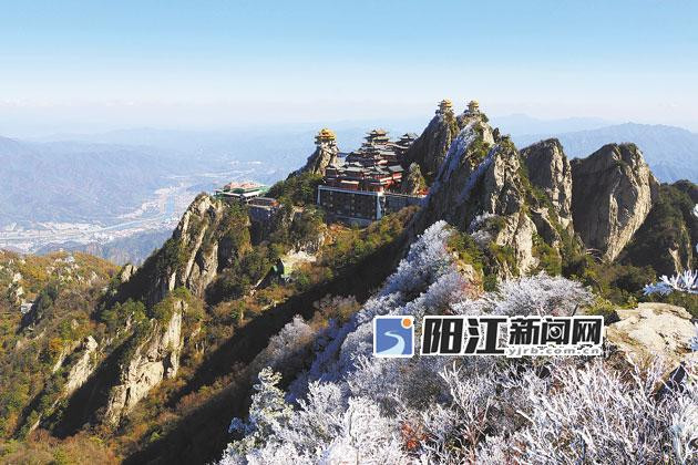 登上山巅无为亭,蓝天下,红黄绿相间的叶子,明澈的雾凇,金光闪闪的宝殿,描绘出一幅天上的风光。长耳鸟“呜呜呼”在雾凇林间环绕,振翅腾飞时,雾凇颗粒簌簌而下,而后又重返松林。一山两季具象化了,原来老君山真是黄河和长江的分水岭。
