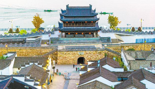 两叶小舟,正驶过梅城澄清门外的新安江。向晚的“严州古城”,城内华灯初上,城外夕霞映水。