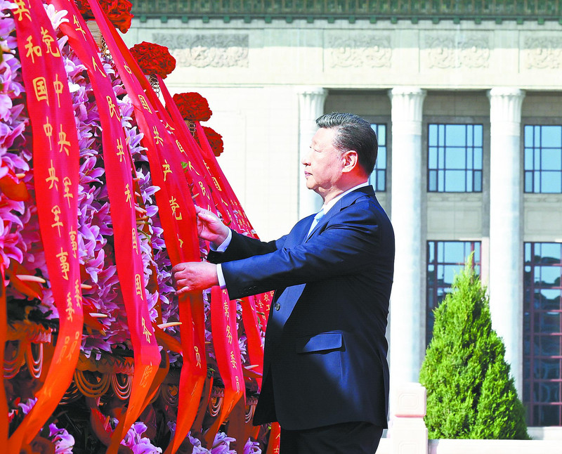 习近平迈步上前,仔细整理花篮缎带。随后,习近平等党和国家领导人缓步绕行,瞻仰人民英雄纪念碑。