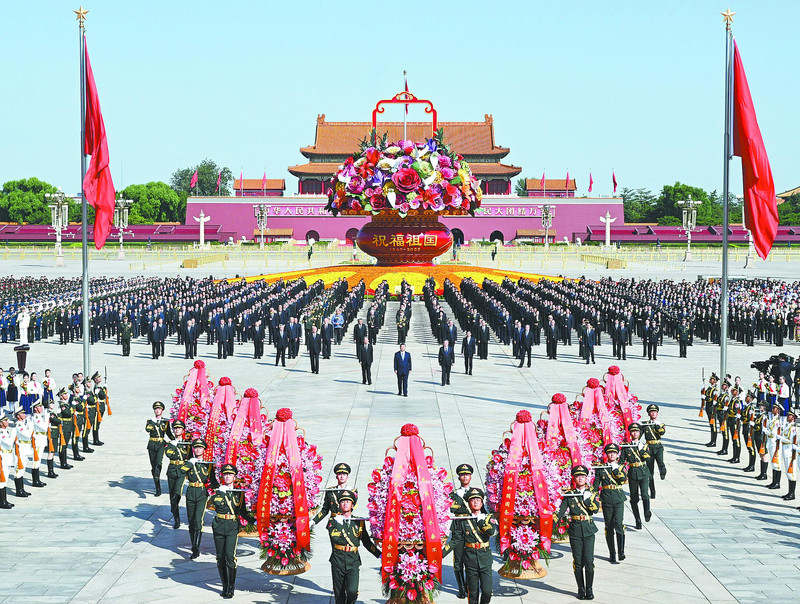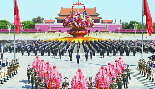方阵前,以中共中央,全国人大常委会,国务院,全国政协,中央军委,各民主党派、全国工商联和无党派爱国人士,各人民团体和各界群众,老战士、老同志和烈士亲属,中国少年先锋队名义敬献的9个大型花篮一字排开,花篮红色缎带上书写的“人民英雄永垂不朽”格外醒目。