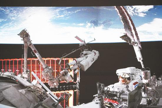 当日下午,记者从北京航天飞行控制中心大厅屏幕看到,航天员武飞身着新上行的最新批次的第二代“飞天”舱外航天服在太空中“游弋”,配合开展了对神舟二十号飞船返回舱舷窗巡检拍照、空间站空间碎片防护装置安装等工作。