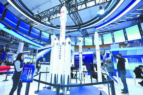 1月23日,观众在2026北京国际商业航天展的星河动力航天展台参观展出的火箭模型。