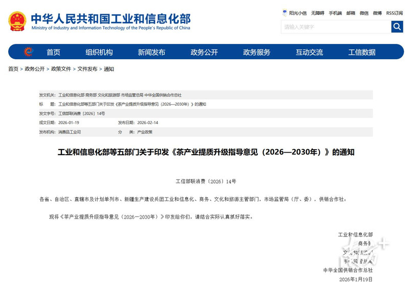 2月14日,工业和信息化部等五部门印发的《茶产业提质升级指导意见(2026—2030年)》对外发布。