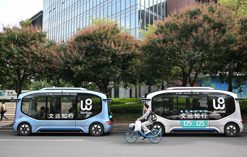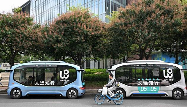 3月24日,在广州市海珠区螺旋大道拍摄的文远知行自动驾驶小巴。