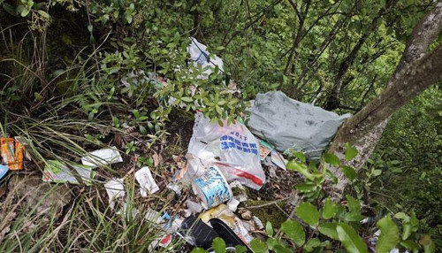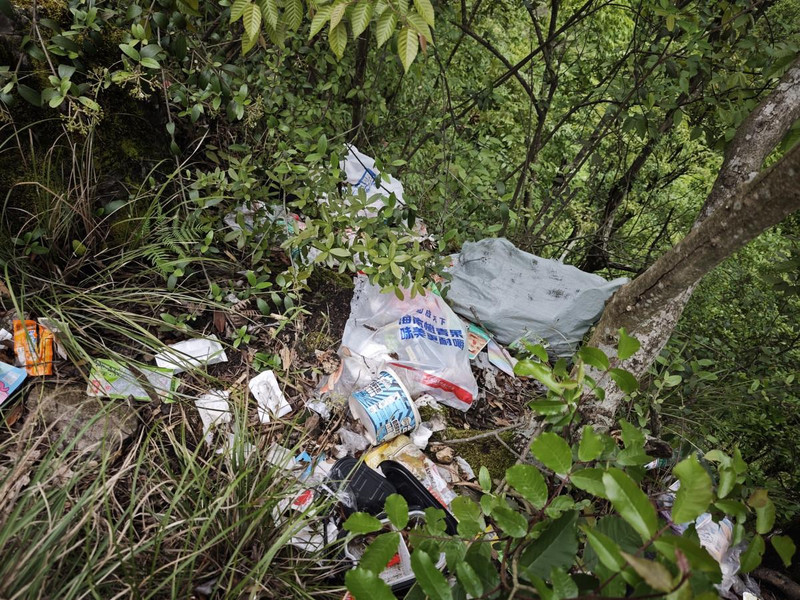 那些被随意丢弃的塑料瓶、食品包装袋、易拉罐、一次性餐盒、果皮纸屑等垃圾,散落在密林草丛,卡在陡峭岩缝,甚至漂浮在水面,在漫山苍翠中格外扎眼。山顶四周,还有部分垃圾已被游客用塑料袋装好,却并未被带下山。