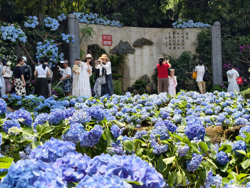 4月25日,游人在广西南宁市青秀山风景区绣球谷赏花游玩。 暮春时节,春花依旧烂漫,人们踏青赏花,尽享春光。 新华社发