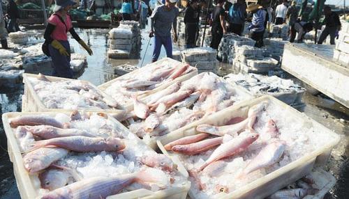 当日下午,记者在闸坡渔港水产品交易市场发现,码头旁停靠着大批回港的渔船,远远望去密密麻麻一片。码头上人头攒动,渔民们正在紧张地忙碌着。他们把船舱里的渔获搬上码头,与顾客交易,将渔获分类过秤,一时间吆喝声、讨价还价声此起彼伏。手推车、三轮车、货车川流不息,一箱箱渔获被搬上货车,再运送到各地市场,到处是一片热火朝天的场景。