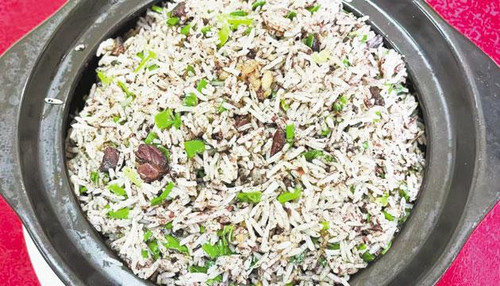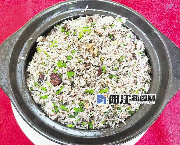 顷刻间,服务员依次上菜,压轴的榄角饭带着砂锅气上桌,黑亮的榄角碎和翠绿的葱花缀在粒粒分明的米粒间,视觉与嗅觉瞬间被乡土风味填满,引得我们垂涎欲滴。当餐桌转盘转到我的面前时,我拿起饭勺盛了一些榄角饭到碗里,拿起小勺子,舀一勺饭放入口里,慢嚼,米粒裹着榄角碎与肉末的咸香,咸而不重、鲜而不腻,还带有一丝米饭的甜味,香气在舌尖散开,实在是美味极了!