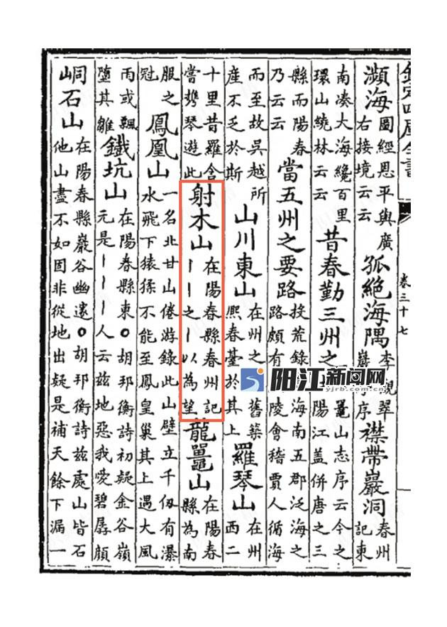 射木山,俗名毂磨岭(见道光《阳春县志》),名称由来不可考,位于阳春县城东南七里许(民国《阳春县志》),海拔462米,“巍峨蓊郁,冠溪水出焉”(《广东图说》)。射木山至迟见于北宋皇祐二年州守河东薛利和所撰《春州记》:“其封域所载,射木山以为望,漠阳之江以通舟楫。”(康熙《肇庆府志》)南宋祝穆《方舆胜览》云:“射木山在阳春县。《春州记》:~~之~以为望。”同时代王象之的《舆地纪胜》(清代重修本)卷九十八“射木山”条所述亦同。又《舆地纪胜》卷九十八“四六”条载:“射木之山以为望,汉阳之江以通舟。”有学者以为“汉阳”系“漠阳”之误。