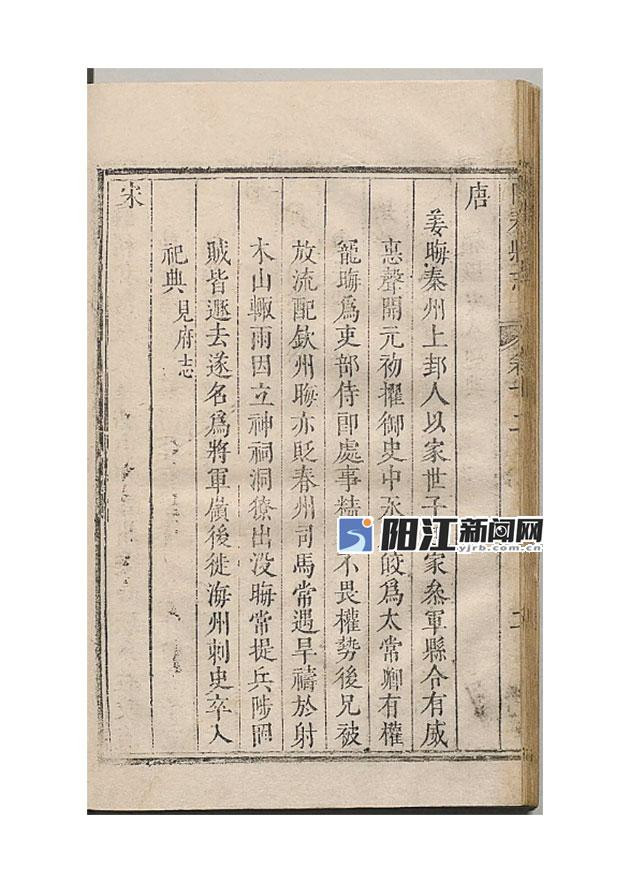 刘裔烗(1627—1689),字嗣昭,号绮园。太平都(今属三甲镇新楼村委会)人。清顺治十七年(1660),考中举人。康熙二十八年(1689),任山东济阳县知县。道光《阳春县志》称其“廉洁慈爱……前邑志,多出其手。著有《述古家训》及《赏奇轩集》行於世。”刘裔烗性爱山水,其《射木山观海》诗云: