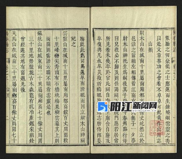 至迟在明弘治年间,已有人将射木山与云灵山看作同一座山。李贤奉敕修的《天下一统志》(弘治十八年刻本)卷八十一“肇庆府”载:“射木山在阳春县南一十五里,县治之按山也。又名云灵山,云罩其上必雨,开则霁。故谚云:‘雨未晴,看云灵。’”后广东顺德人戴璟纂修的《嘉靖广东通志初稿》、万历年间郭榧纂修的《广东通志》、陈懋学辑的《事言要玄地集》、曹学佺的《大明一统志名胜志》(崇祯三年刻本)、康熙年间康善述纂修的《阳春县志》(康熙二十六年刊本)等,均沿其说。譬如《事言要玄地集》卷七载:“射木山,阳春南,县之案山。又名云灵山……”又如《大明一统志名胜志》“射木山”条,所载略有不同,尚言唐春州司马姜晦祷雨立庙、宋春州知军州事李符谒庙诸事,详见后述。再如康熙《阳春县志》卷四“山川”载:“射木山,在城南十五里,属南厢,高百余丈,周围数十里,巍峨蓊郁,屹然立于邑治之前稍左……”
