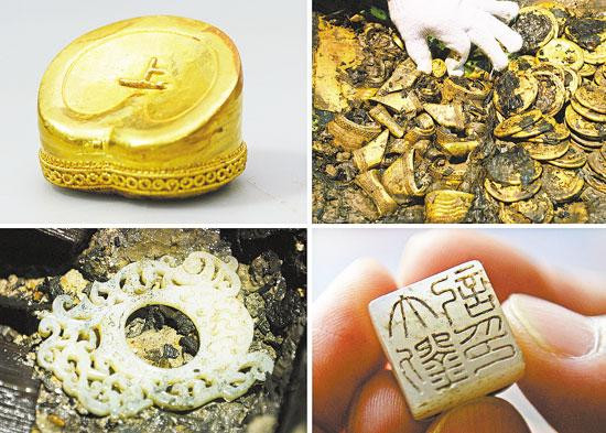 这是一张拼版照片。左上图:海昏侯墓出土的马蹄金;右上图:海昏侯墓主棺出土的金饼、马蹄金、麟趾金和金板;左下图:海昏侯墓出土的玉佩;右下图:海昏侯墓出土的玉印。 万象 摄