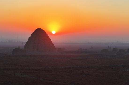 寒冬时节,晨曦中的西夏陵与缤纷霞光及峰峦叠嶂的贺兰山共同形成雄伟壮丽的景观。2025年7月11日,“西夏陵”被列入《世界遗产名录》。 袁宏彦 摄