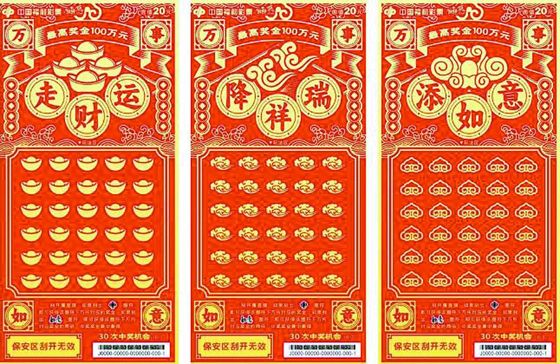 “万事如意”即开票全套共6张,每张面值20元,最高可中100万元大奖。游戏规则简单易懂,刮开覆盖膜,若刮出“灯笼”图符,即可获得该图符下方所对应的奖金;若刮出“如意”图符,即可获得该图符下方所对应奖金的两倍,且中奖奖金兼中兼得,为购彩者带来更多收获和惊喜。