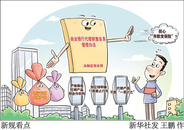 代销业务在满足人民群众多样化财富管理需求的同时,也存在部分机构销售误导、夸大宣传等侵害消费者权益的情形,“存款变保险”等乱象时有发生。金融监管总局日前出台《商业银行代理销售业务管理办法》,明确监管规则,统一监管标准,全面规范商业银行代销业务,对金融消费者的保护进一步升级。 王鹏 作