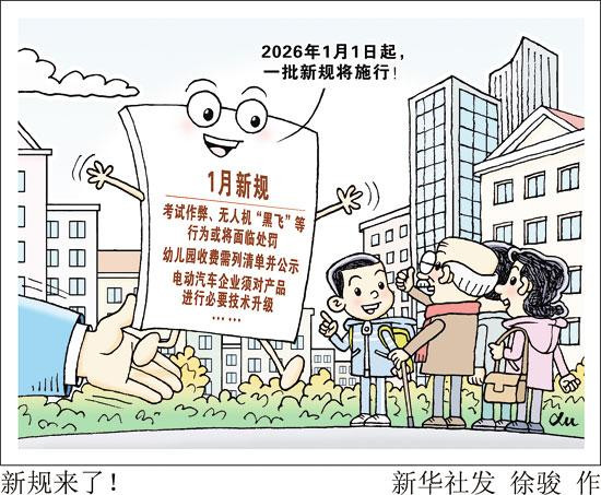 2026年1月1日起,一批新规将施行,事关社会治安、保育教育、电动汽车、网络安全等多方面,更好回应群众关切,护航美好生活,增添发展活力……一起来看,哪些你最关注?徐骏 作
