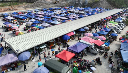 航拍视角下的大令圩各类摊位整齐有序。