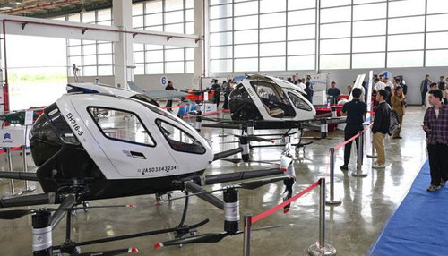 嘉宾在展区参观各种无人机、无人驾驶载人航空器。 梁文栋 摄
