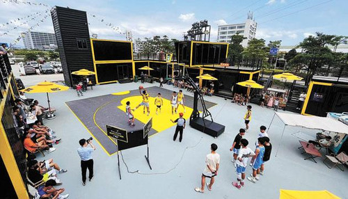 作为“阳江三宝”之一,阳江豆豉驰名中国。近日,记者走进“奋豆小市镇”,只见门口张贴了卡通形象的豆豉海报,黑色的集装箱组合成不规则形状的建筑物,构建多层次的空间系统,搭配明黄色的框架,十分显眼,具有独特的风格。“奋豆小市镇”占地1500平方米,一楼设有篮球场、网红打卡点,分布书法才艺馆、小酒馆、餐饮店等,三楼设有空中音乐会演出场地,夜间上演空中芭蕾,通过元宇宙互动打卡、美食体验、竞技运动、高空炫舞演出、休闲拍照及自媒体互动等时尚业态,打造文化与科技结合的文旅小市镇。