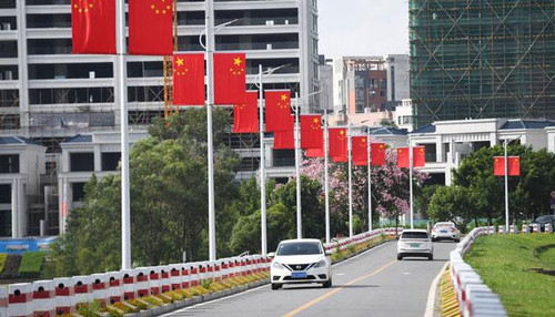 市区沿湖路的路灯杆上悬挂着鲜艳的五星红旗。宋福亮 摄