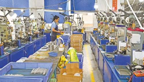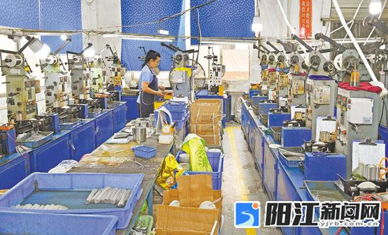 2月20日,记者来到位于阳东区红丰镇的韦邦电器厂房,见到上百名工人奔忙在压粉、绕丝、装配等各个车间,机械作业声此起彼伏。走进绕丝车间,3名女工同步操作着50台电阻丝绕线机。根据功率大小,每台绕线机所制出的成品粗细也有所不同,最快几秒就能送出一段软弹簧状的电阻丝。
