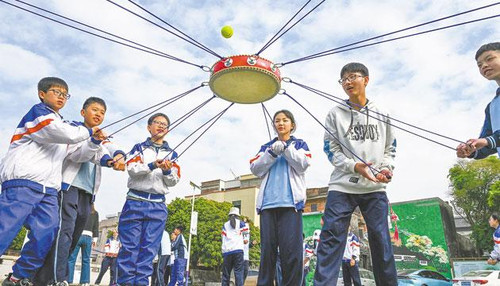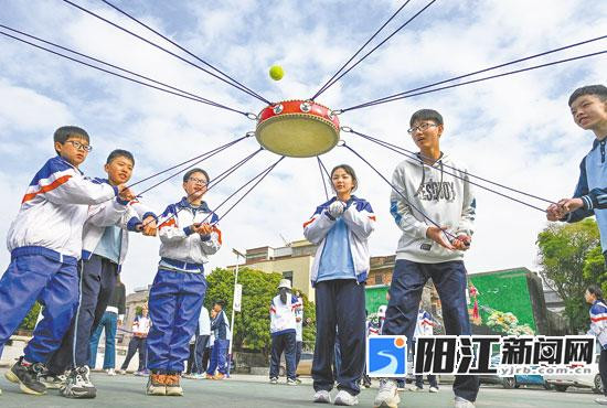 学生们正在参与“鼓动人心”团队游戏。 梁文栋 摄