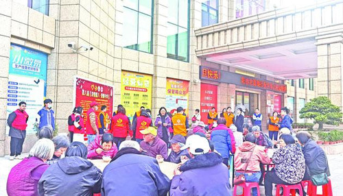 市民围坐在一起喝腊八粥。 陈炯 摄