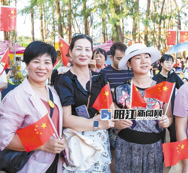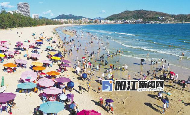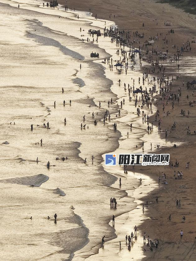 阳东东平镇珍珠湾景区,游客在海滩上游玩踏浪。 小谭 摄