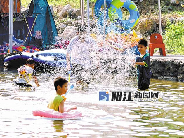阳东大八镇龙心村,孩子们在雨林河中嬉戏泼水,尽情享受快乐时光。 小米 摄