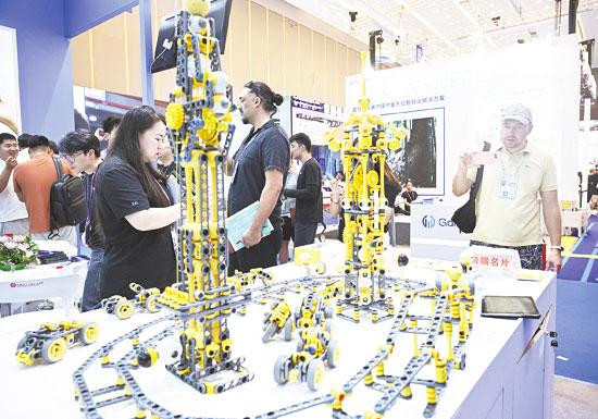 境外采购商在第138届广交会服务机器人专区观看教育机器人产品。肖恩楠 摄