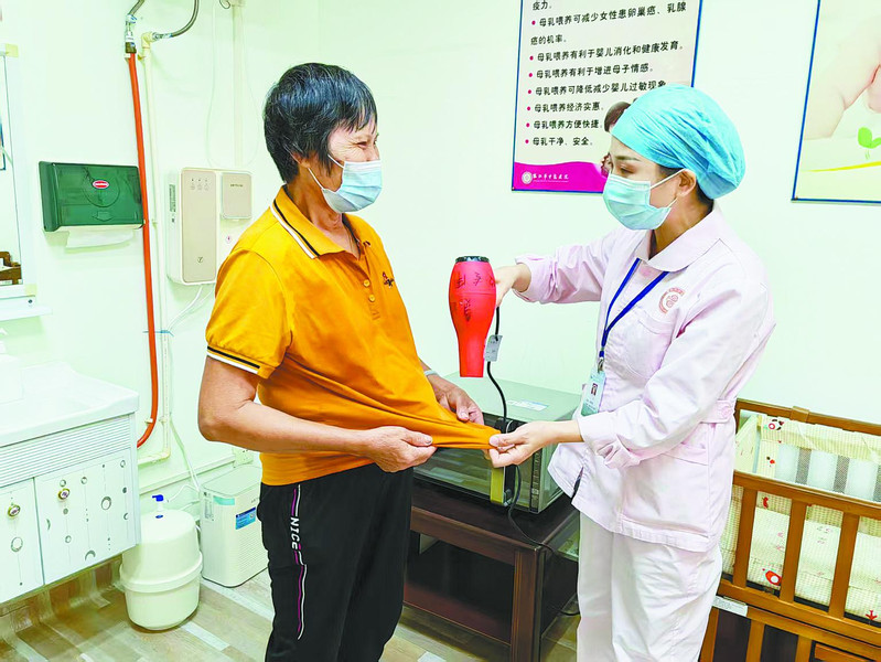 客服中心工作人员为冒雨前来就诊的患者吹干衣服。受访单位供图