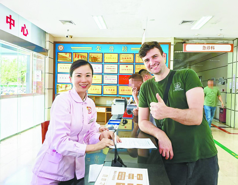 客服中心工作人员全程陪伴语言不通的外国患者就诊。