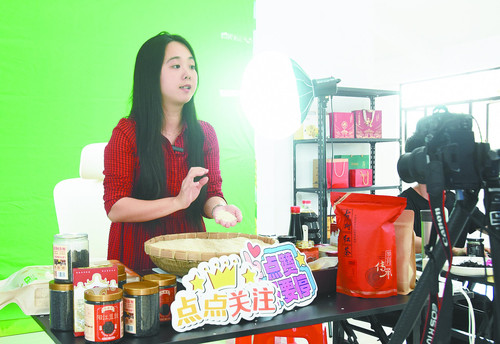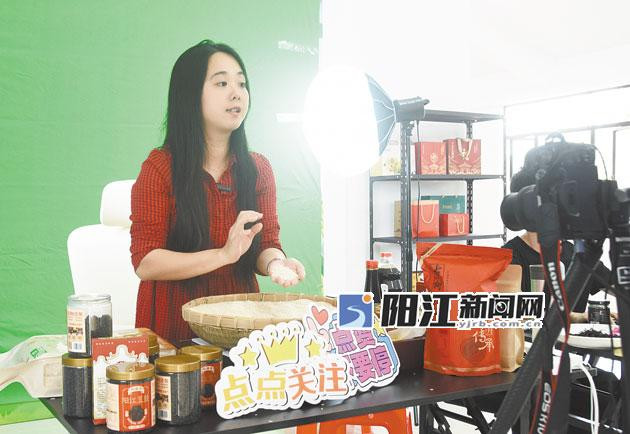 11月11日下午,在阳东区合山镇那石村的电商直播间里,主播向网友展示刚收割的富硒丝苗米。这场“双十一”助农直播,让村集体的乡土好物借电商“飞”出了乡村。 陈建华 摄影报道