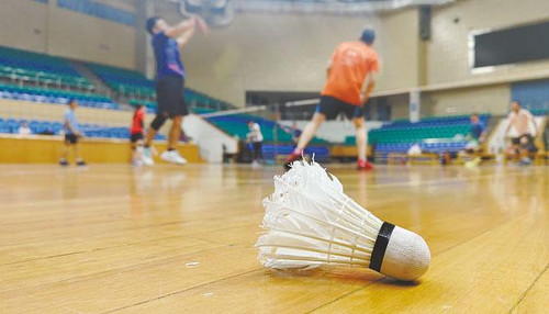 市民在市体育馆打羽毛球。