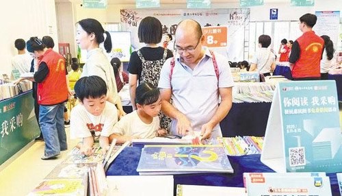 今年南国书香节期间,家长带孩子认真挑选书籍。 施徒 摄