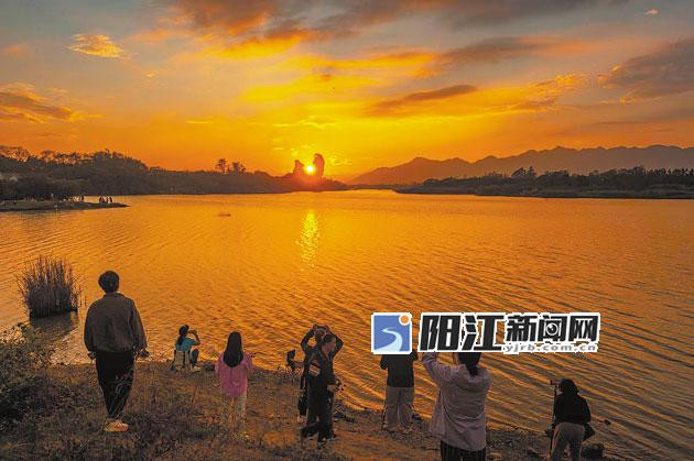 影友们在漠阳江边对着落日拍照。 张晓山 摄