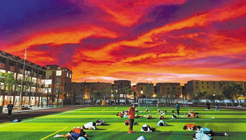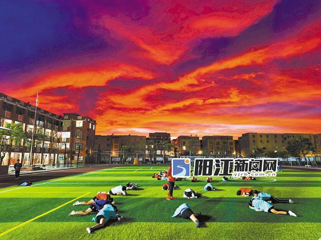 紫红色的晚霞与绿茵场地相映成趣,足球教练带领学生进行训练后的放松运动。 司徒攀 摄