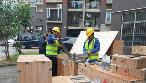 施工人员整理已运抵现场的电梯部件。 受访单位供图