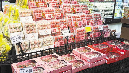 当日上午10时,记者在市区东汇城天虹超市看到,生鲜区内已摆放多个品种的盒装草莓。其中,250克装的天使草莓售价39.9元,果实呈白色;300克装的章姬草莓售价32.9元;500克装的红颜草莓售价49.9元。超市工作人员告诉记者,当下因为是草莓上市初期,价格相对较高。在新达城卜蜂莲花超市,草莓同样按盒售卖,约15颗一盒的精选草莓售价19.8元,约8颗一盒的奶油草莓售价为8.8元。