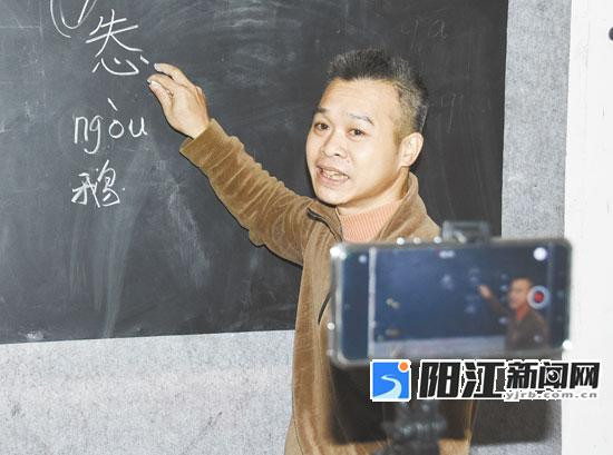 在民间,阳江话的保护也以更鲜活、更“接地气”的方式进行着。记者来到阳东区北惯镇,探访“书者利赞”视频号的创作者利有赞,他的“工作室”就设在家中一角:一块用来板书的黑板、一个简易手机支架,就是创作装备。然而,正是这方寸天地,却吸引了来自各地的近两万名粉丝关注。