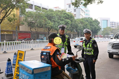 “同志,骑电动自行车不佩戴安全头盔,一旦发生事故,头部没有任何保护,很容易造成严重伤害,为了安全,以后一定要养成佩戴安全头盔的习惯。”在检查点,执勤民警对一名未佩戴安全头盔的电动自行车驾驶人进行了批评教育,并现场向其发放了安全出行宣传手册。
