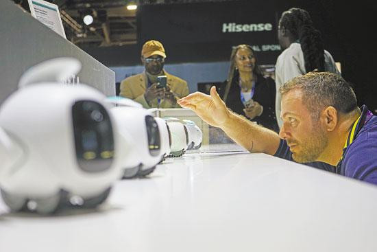 1月7日,一名男子在2026年美国拉斯维加斯消费电子展(CES)海信展台观看搭载新一代AI智能识别引擎的陪伴机器人Beta。 曾慧 摄