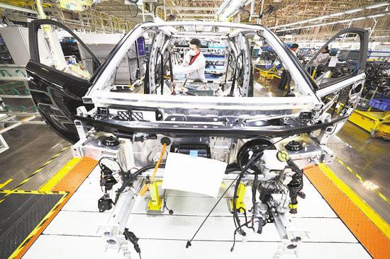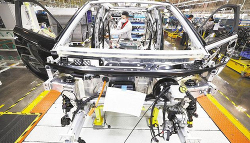 1月8日,在奇瑞新能源汽车股份有限公司石家庄分公司总装车间,工人装配新能源汽车。 梁子栋 摄