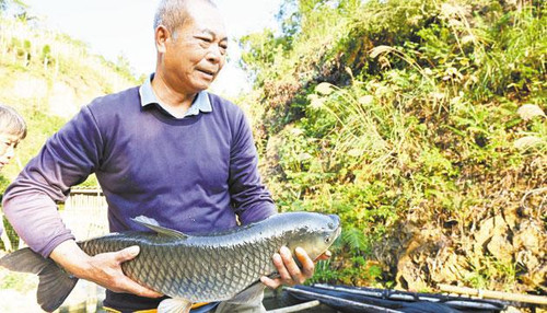 养殖户张东海从池中捞起一条大鱼,重达七八公斤。 梁文栋 摄