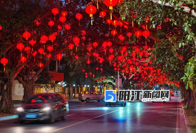 阳东区德政路两侧绿化树枝头挂满红灯笼,年味十足。宋福亮 摄