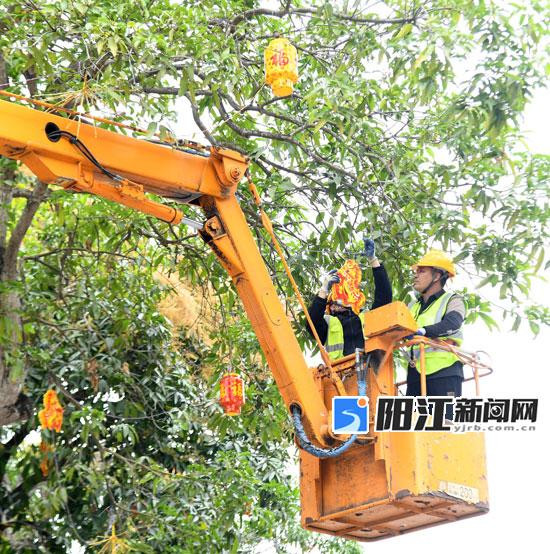 阳春市迎宾路,工作人员在安装新年灯饰。